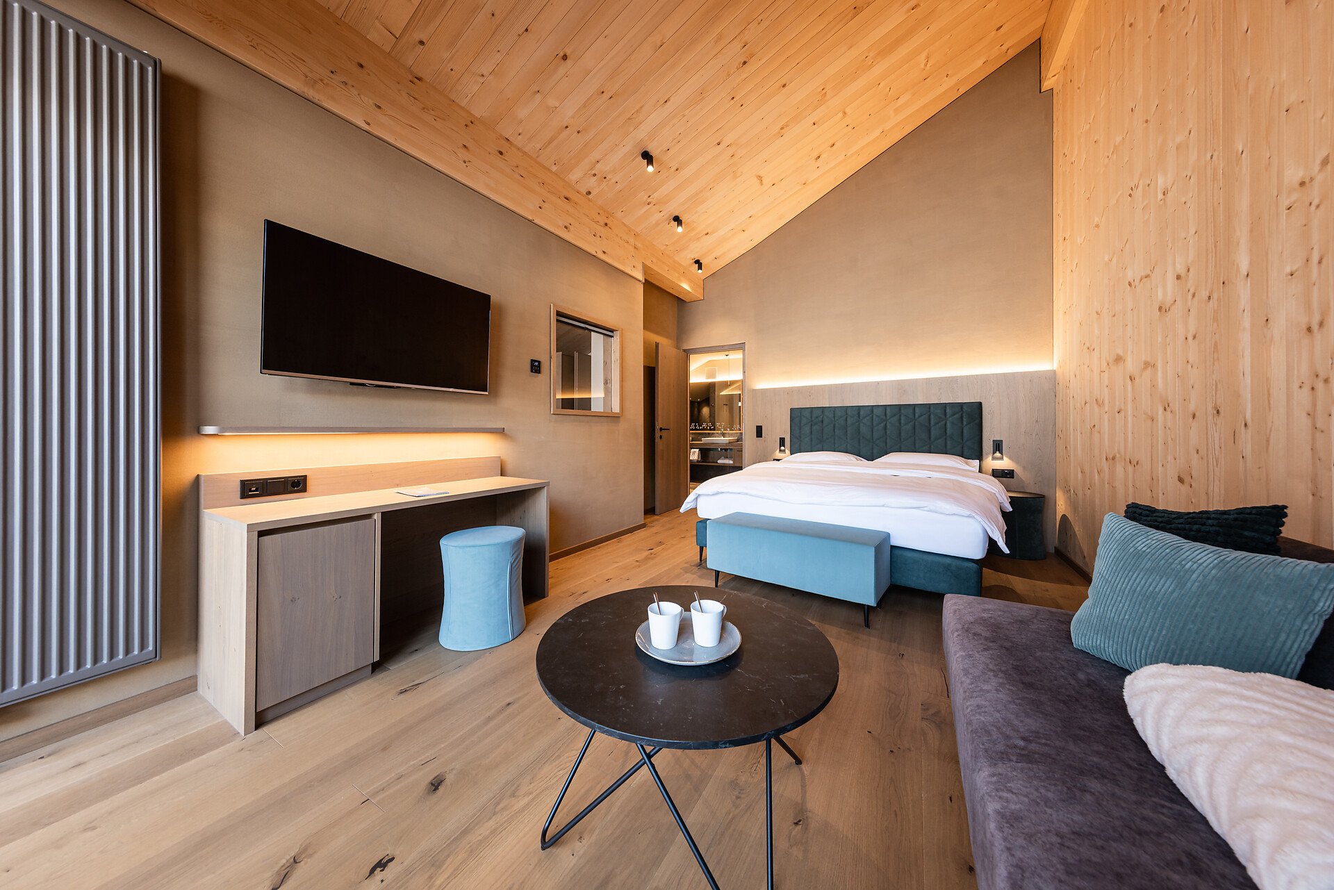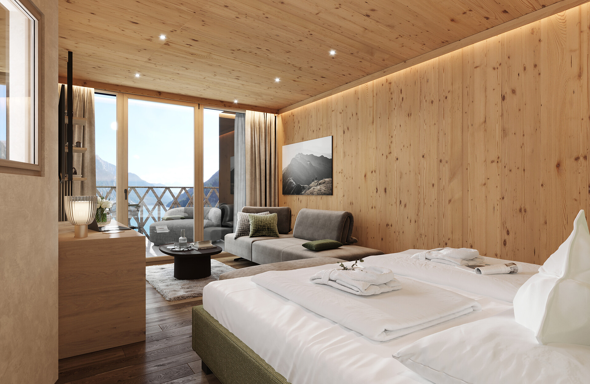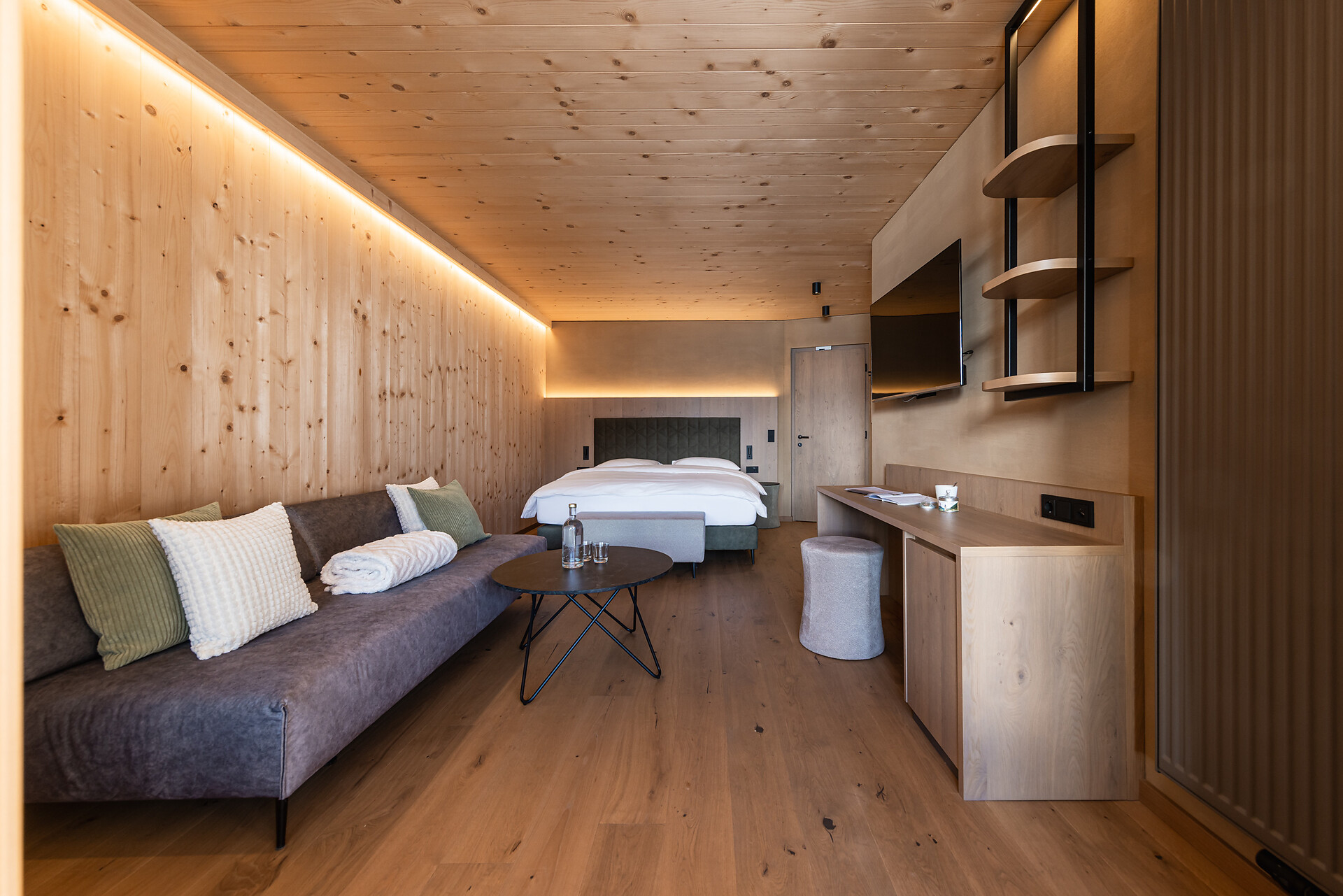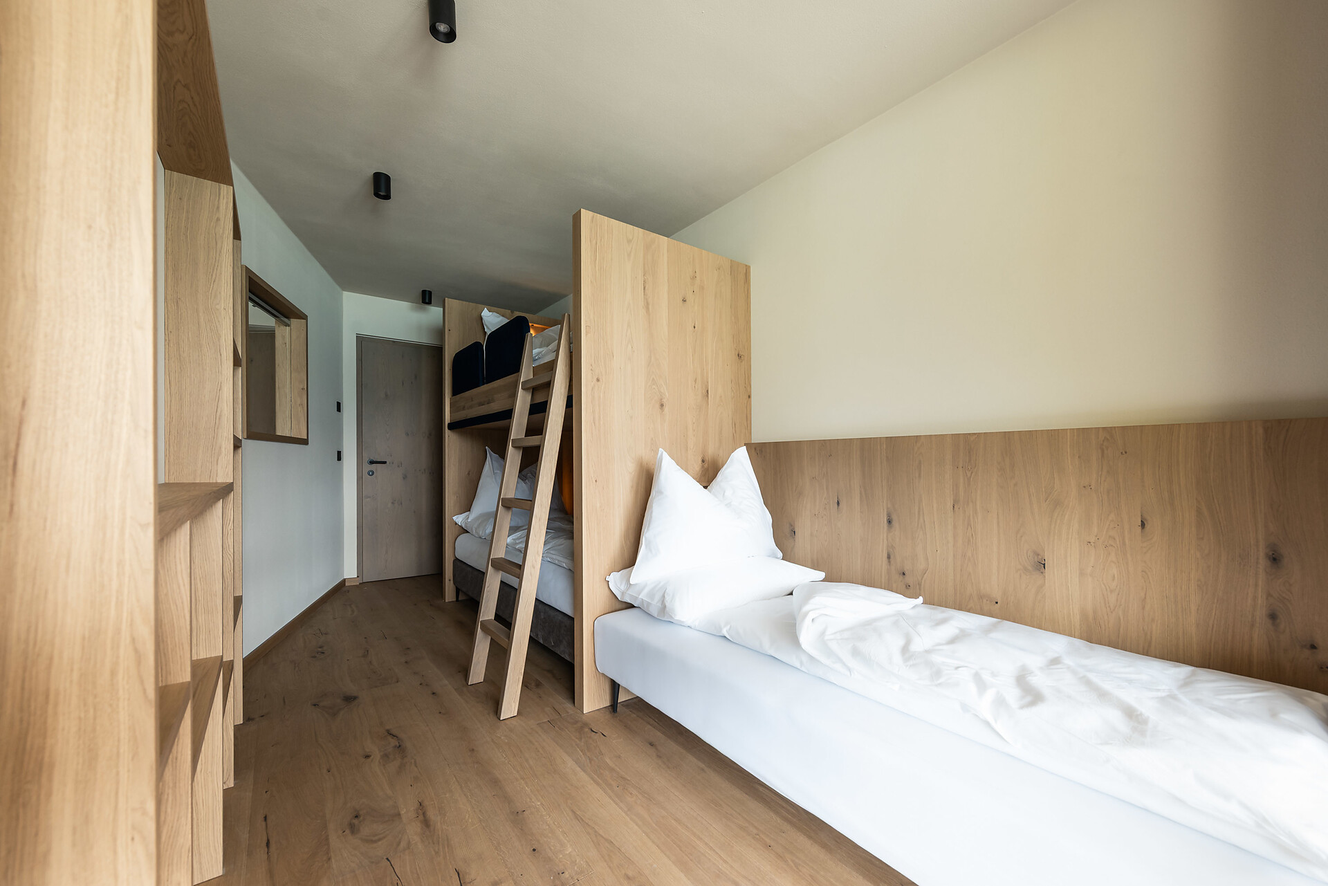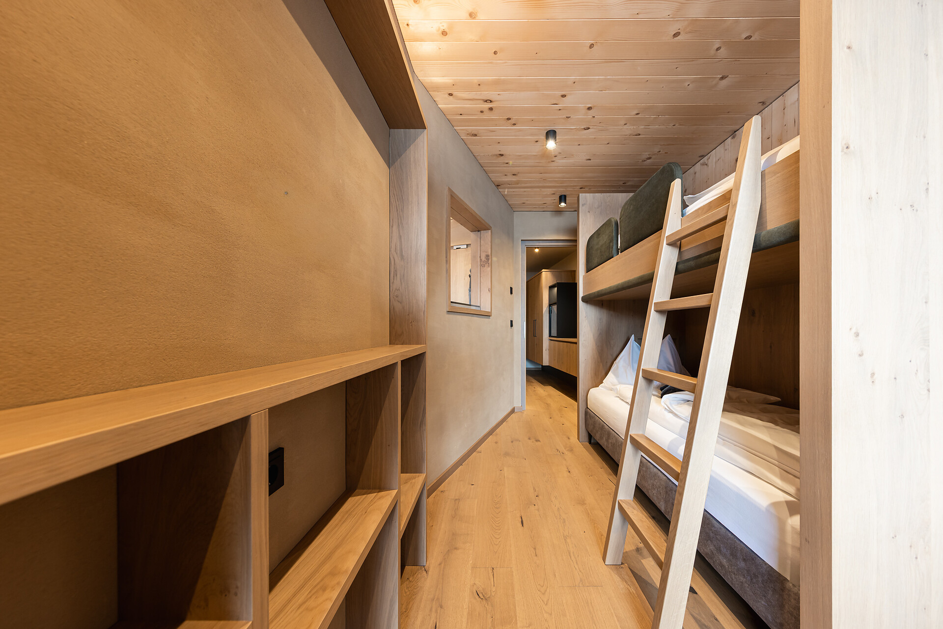 „65 individuelle Familiensuiten und Studios, die meisten mit Blick auf den Reschensee und ausgestattet mit natürlichen, nachhaltigen und regionalen Materialien, fügen sich organisch in das von HOLZIUS in Vollholzbauweise geschaffene Ganze“, erzählt Gastgeber Lukas Gerstl. Gemeinsam mit den zahlreichen Spaßmöglichkeiten – Aqua Fun Park, Abenteuerspielplatz, Spa-Landschaft und vieles mehr – in denen ebenso auf ein unverfälschtes Erleben wert gelegt wird (plastikfreies Spielmaterial, natürlich behandeltes Poolwasser, regionales kulinarisches Angebot, etc.), wird eine kleine Utopie von der perfekten Atempause in und mit der Natur im echten Leben wahr.