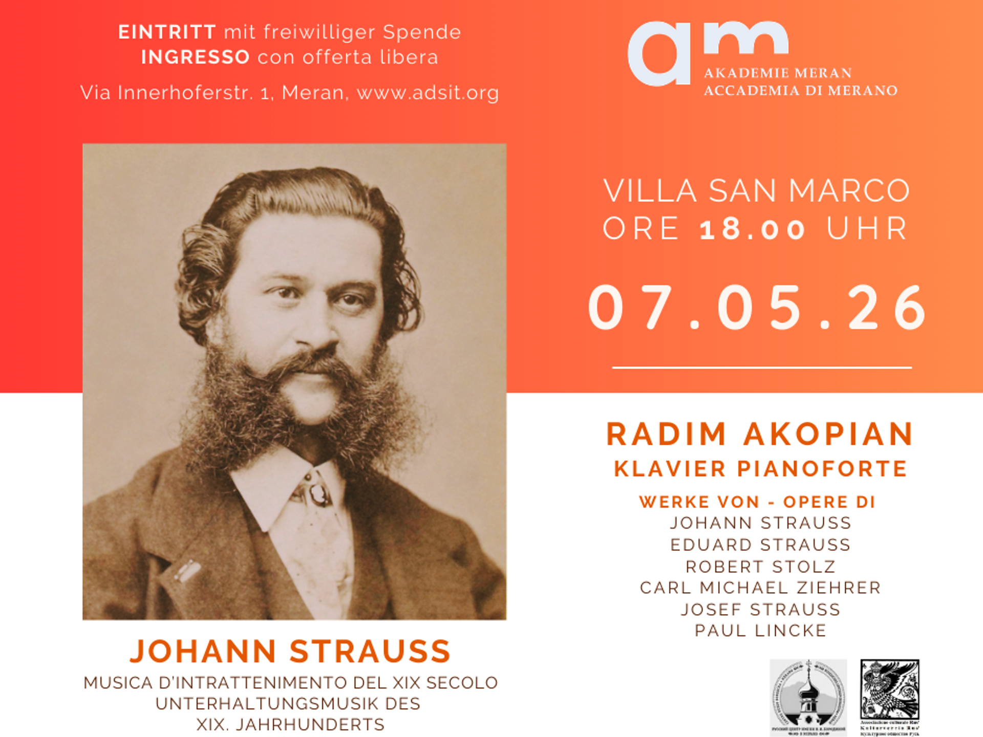 Music of the 19th century, piano: Radim Akopian. Free entry by donation.