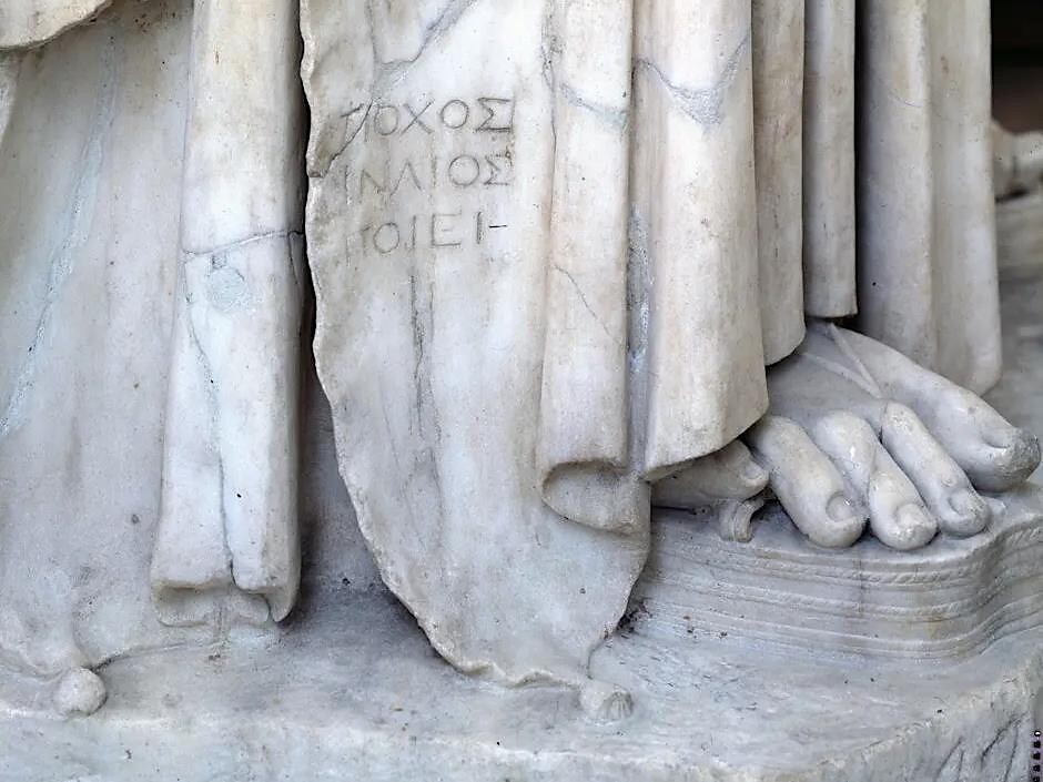 Sebbene siano piuttosto rare le firme d’artista sulle opere d’arte antica, nel Museo Nazionale Romano se ne possono riconoscere alcune incise su statue, gemme, rilievi e affreschi. Queste firme, spesso appena leggibili, raccontano una storia di orgoglio e di identità professionale in un’epoca in cui l’arte era considerata soprattutto un mestiere e non ancora un’espressione personale come la intendiamo oggi.